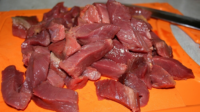 Итак, нарежьте говядину на куски поперек волокон. Куски могут быть как крупными, так и не очень.