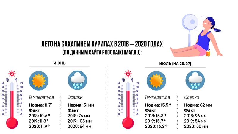 Лета сахалинцы и курильчане всегда ждут с нетерпением, хотя и знают наверняка: солнца на наших островах будет мало, а вода, скорее всего, останется холодной. Корреспондент РИА «Сахалин-Курилы» проанализировал нашу погоду летом за последние два года.