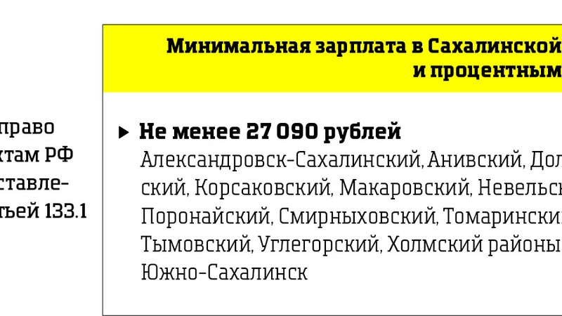 В качестве одного из действенных механизмов достижения этой цели с 2020 года возобновилась практика заключения Соглашений о минимальной заработной плате (МЗП) в Сахалинской области. Такой документ в декабре прошлого года подписали правительство региона, областной союз организаций профсоюзов и Союз промышленников и предпринимателей региона. В соответствии с ним в Сахалинской области с 1 января 2021 года МЗП установлена в размере 12 900 рублей (до удержания налога на доходы физических лиц).