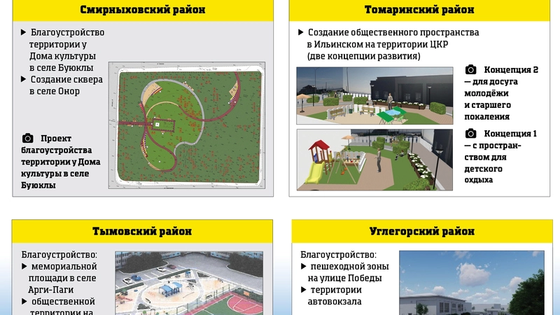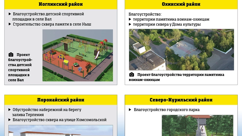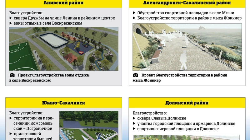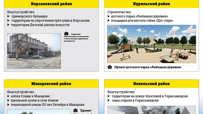 В Курильске построят рыбацкую деревню для детей или дог-парк. А вот проекты в Невельском районе касаются жителей Горнозаводска, там планируется обустроить общественную территорию по улице Шахтовой или сельскую зону отдыха.