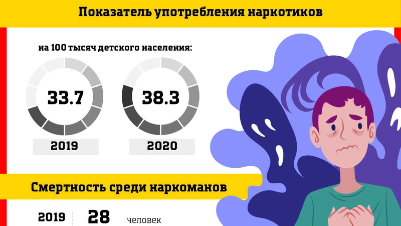 Что касается динамики больных наркоманией, снижение отмечается в 11 районах, рост - в 7 районах. А показатель первичной заболеваемости наркоманией в 2020 году на 100 тысяч населения снизился почти вдвое.