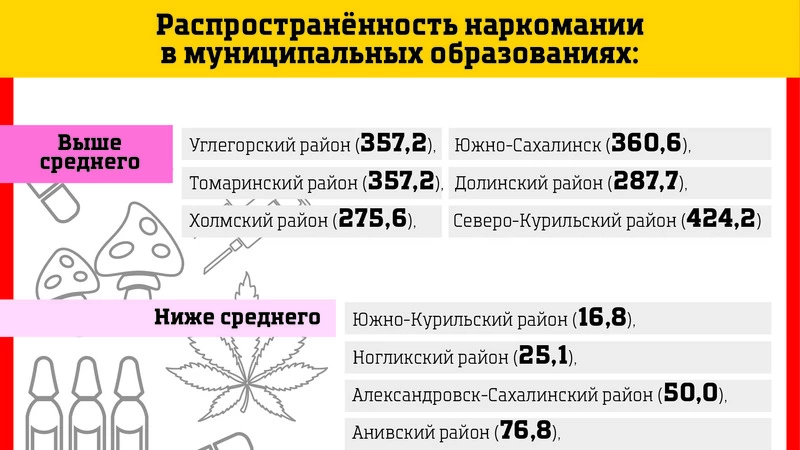 Распространенность наркомании выше среднего отмечается в Углегорском, Томаринском, Холмском, Долинском, Северо-Курильском районах и Южно-Сахалинске.