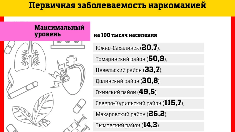 Минимальный уровень первичной заболеваемости наркоманией отмечен в Поронайском и Холмском районах.