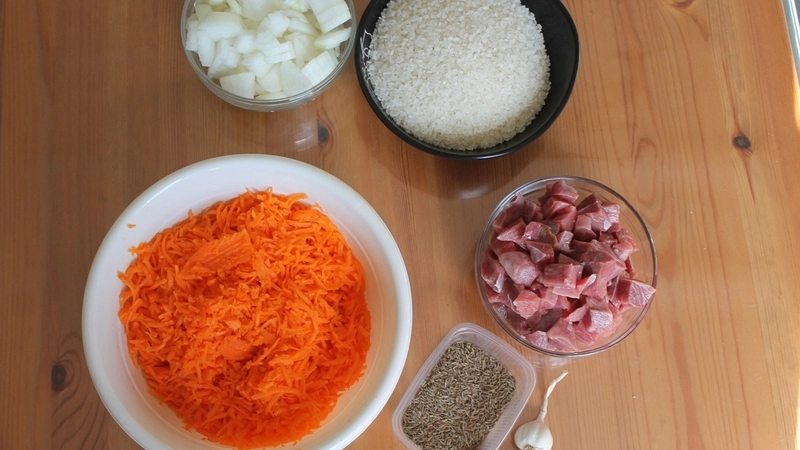 На подготовительном этапе мясо режем небольшими кусочками, лук – как можно мельче. Палочка-выручалочка в любом хозяйстве – мясорубка со специальной насадкой для шинковки овощей. С ее помощью натереть морковь можно всего за одну-две минуты. Если такого приспособления нет, используем ручную терку или режем морковь брусочками. Кстати, последний вариант в среднеазиатской кулинарии считается наиболее верным, но повторюс: мы отдаем предпочтение скорости и простоте.