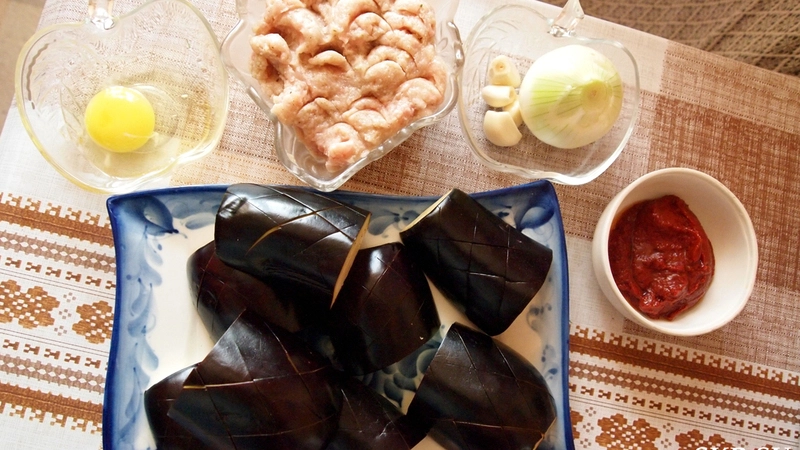 Теперь пора браться за начинку. Смешиваем в миске фарш, натертые лук и чеснок, яйцо, муку и специи. Начиняем ими баклажаны. С соусом мудрить не придется — надо лишь перемешать его составляющие в отдельной чашке.