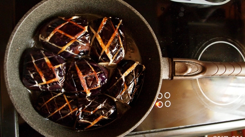 На сковороде, политой растительным маслом, обжариваем баклажаны — каждую из долей по две минуты. Затем выливаем в сковороду соус и тушим содержимое 20 минут.