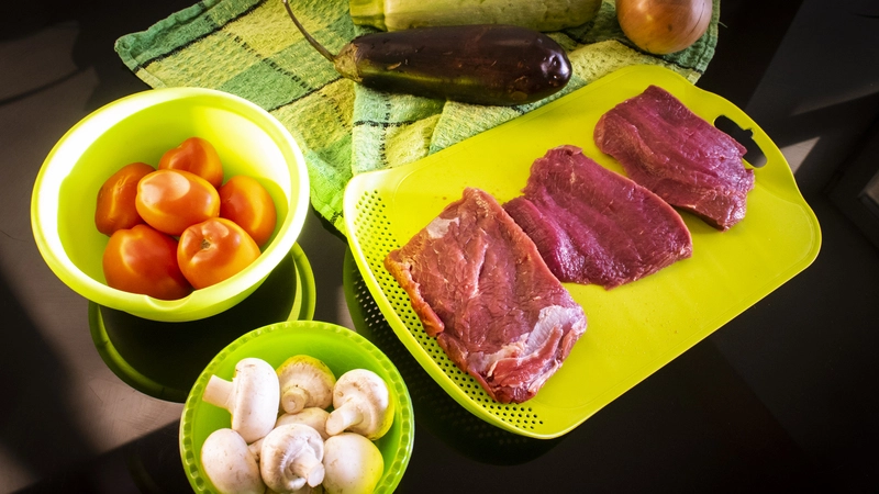 Говядину разделайте на порционные куски для стейков. Каждый ломоть накройте пищевой пленкой, отбейте сначала скалкой, а потом специальным молотком с обеих сторон. После этого снимите пленку и сделайте диагональные надрезы крест-накрест на поверхности кусков. Луковицу разделите пополам. Одну часть нарежьте мелкими кубиками, вторую натрите на мелкой терке до состояния кашицы: мякоть должна дать сок.