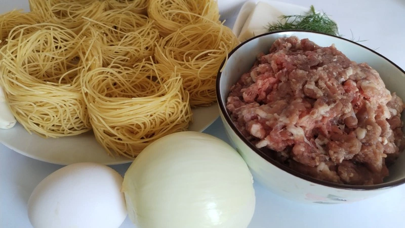 Отправить форму в предварительно разогретую до 180 градусов духовку на 30–35 минут. Готовое блюдо почти полностью впитает в себя жидкость, а сами макаронные гнёзда увеличатся в размере. Посыпать их мелко рубленым укропом, подавать горячими.