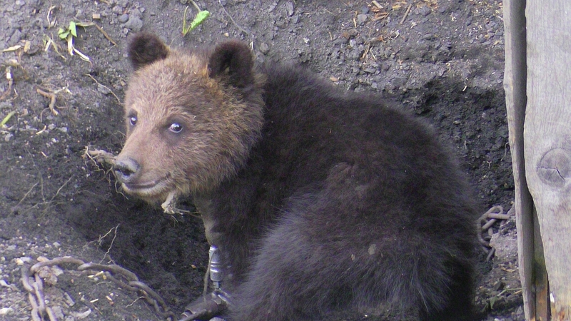 Маленький медвежонок (самочка трех-четырех месяцев от роду) содержался у тымовчанина прямо во дворе его частного дома. Госинспектор только взглянул на зверя и сразу окрестил Юлькой. Малышка сидела на цепи. «Владелец» объяснил, что до этого он поместил животное в сарайчик, но, окрепнув, найденыш попросту разломал хилую хозпостройку. Тогда он не придумал ничего лучше, как посадить Юльку на цепь. Территория вокруг дома закрытая, скорее всего, соседи даже не подозревали о том, что здесь происходит.