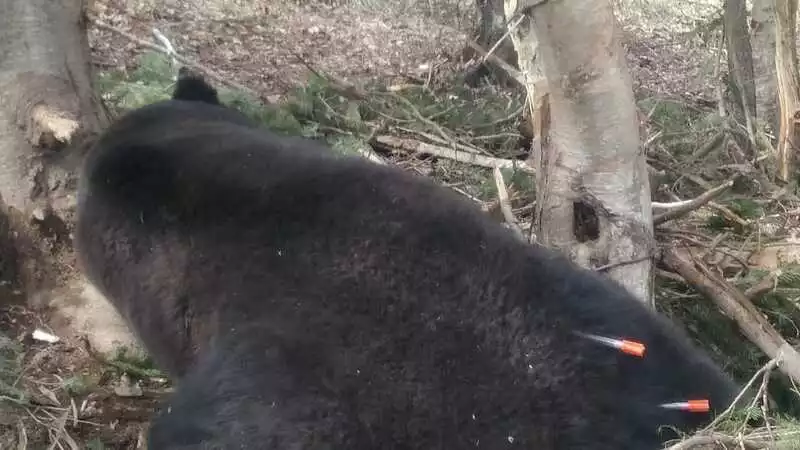 Стрелять шприцами с препаратом нужно с расстояния не более 20 метров. Иначе игла просто не пробьет толстую шкуру. Первый выстрел пришелся в спину. Но косолапый сдаваться не собирался. Он вырвал шприц. Так же случилось и во второй раз. Третий выстрел оказался более точным. Хищника начало клонить в сон, реакции его замедлились. Он начал прикладываться на землю.