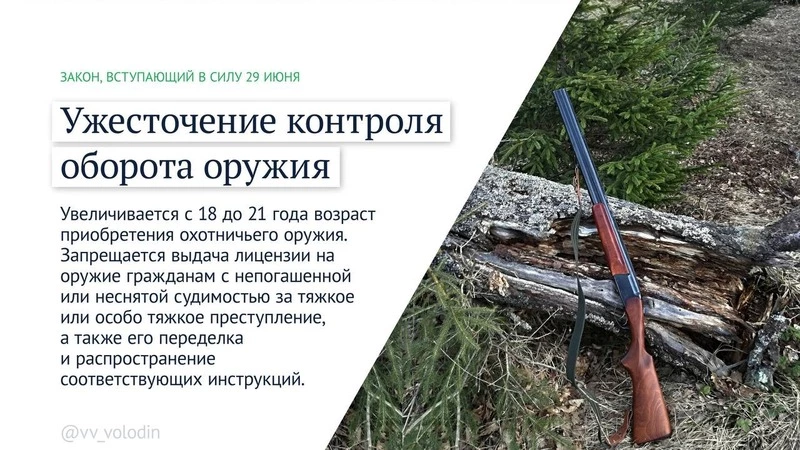Ужесточение правил произойдет еще в одной сфере — оборот оружия. С 29 июня возраст приобретения охотничьего оружия увеличится с 18 до 21 года, а гражданам с непогашенной или неснятой судимостью за тяжкие преступления и вовсе запретят выдавать лицензии. Кроме того, запрет наложат на переделку оружия и распространение инструкций о том, как это сделать.