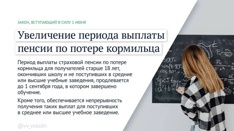 С 1 июня будет продлен период выплаты страховой пенсии по потере кормильца. Нововведение касается получателей старше 18 лет, которые уже окончили школу, но не поступили в средние или высшие учебные заведения. Они будут получать выплату до 1 сентября того года, в котором завершено обучение в школе. Также закон обеспечит непрерывность поступления пенсии по потере для поступивших в сузы или вузы.