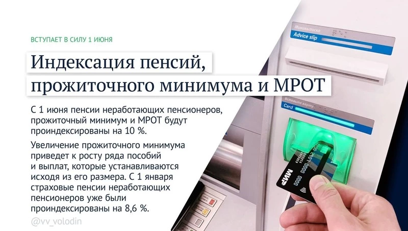 С 1 июня на 10% проиндексируют выплаты неработающим пенсионерам, размер прожиточного минимума и минимальный размер оплаты труда. Повышение потянет за собой рост ряда пособий и социальных выплат — тех, на которые влияет прожиточный минимум. В частности, это меры поддержки беременных и семей с детьми, оказавшихся в трудной финансовой ситуации.
