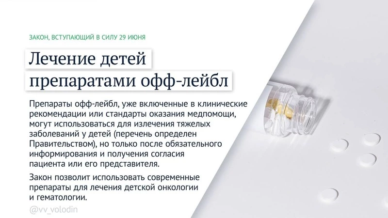 С 29 июня вступит в силу закон, который откроет новые возможности в лечении тежелых заболеваний у юных россиян. Офф-лейбл — это современные препараты, которые уполномоченные органы еще не утвердили для применения по определенным показаниям. Их можно будет использовать для лечения детей с онкологическими, гематологическими и тяжелыми орфанными заболеваниями — точный перечень утвердило Правительство РФ.
