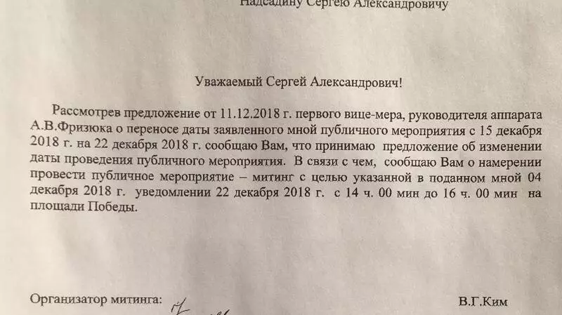 В администрации города подтвердили, что получили от организаторов уведомление о согласии переноса митинга.