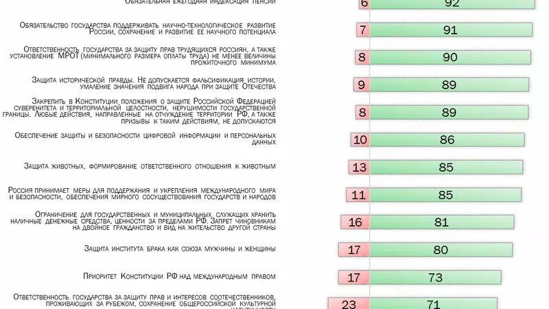 Примерно 91 процент россиян поддерживают обязательство со стороны государства поддерживать научно-технологическое развитие страны. Около 90 процентов согласны с необходимостью ответственности государства за права трудящихся и установление МРОТ не менее прожиточного минимума. Положение о территориальной целостности и неделимости государственной границы, защиту исторической правды и запрет на фальсификацию истории считают важным 89 процентов опрошенных.