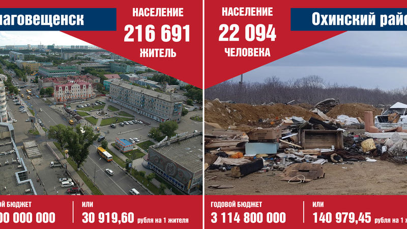 Если оценить состояние улиц и дворов, добавить к расчетам затраты на фактический снос аварийных домов и ликвидацию свалок в Охе, то, несмотря на высокие цифры, муниципалитет сильно проигрывает другим городам Дальнего Востока. Это можно рассмотреть наглядно, опираясь на цифры и сравнив фотографии «нефтяной столицы Сахалина» и более бедных населенных пунктов.