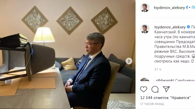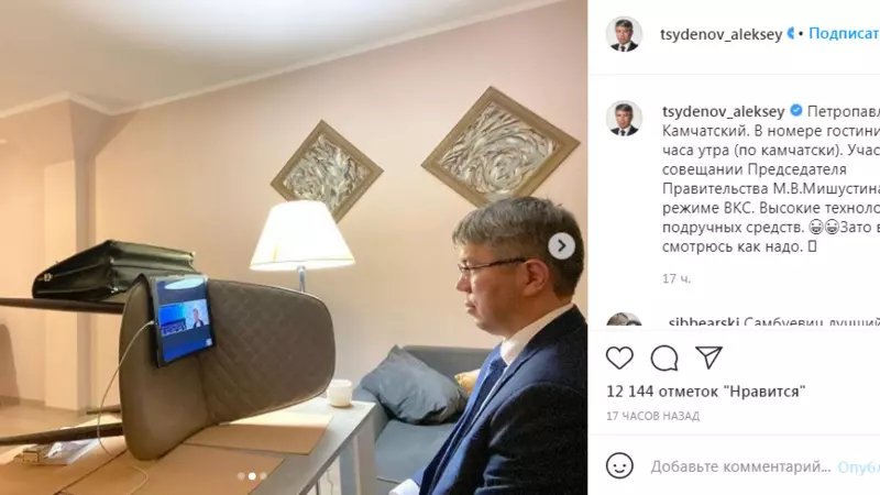 «Петропавловск-Камчатский. В номере гостиницы. Четыре часа утра (по-камчатски). Участие в совещании председателя правительства М. В. Мишустина в режиме ВКС. Высокие технологии из подручных средств. Зато в кадре смотрюсь как надо», — написал Цыденов в своем Instagram-аккаунте.