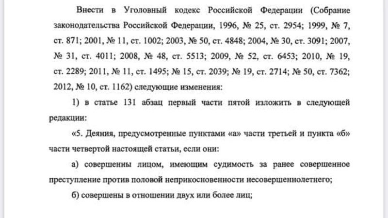 Также предлагалось установить максимально жесткое наказание за это преступление. Речь идет о пожизненном заключении для любого педофила, если преступление сопряжено с насилием, тяжкими последствиями или совершено в отношении двух или более несовершеннолетних, а также за любое повторное преступление против половой неприкосновенности несовершеннолетних.