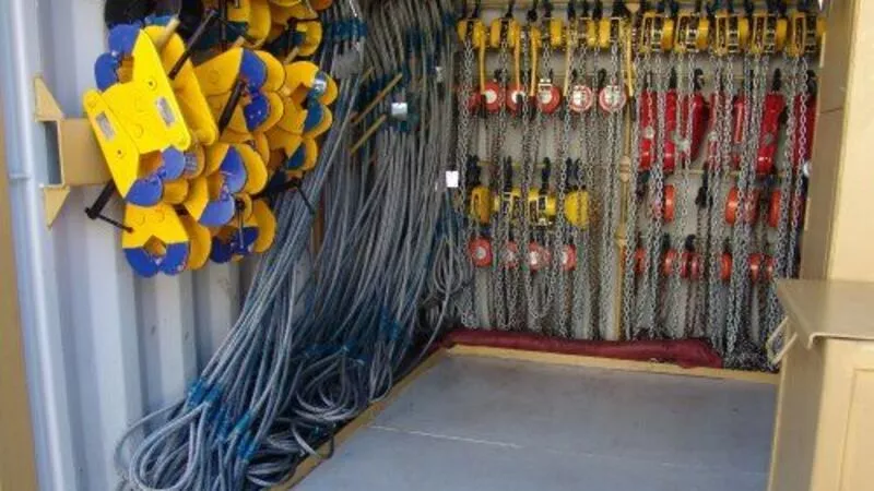 В комплект контейнера входит широкий перечень грузоподъемного оборудования: стропы, тали и захваты. Всего более 30 наименований. Это удобный для транспортировки и быстрого развертывания готовый к эксплуатации рабочий отсек. Каждая единица оборудования прошла инспекцию и имеет сертификат.