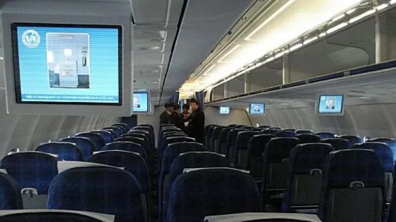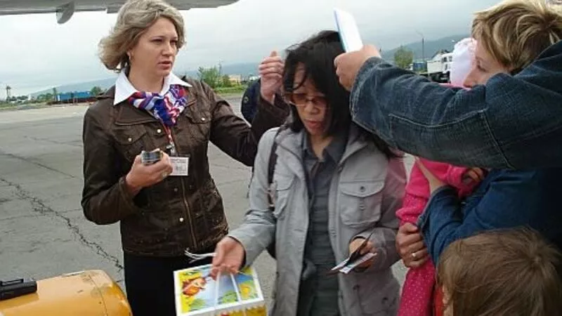 После регистрации пассажиров представители авиакомпании провели для журналистов экскурсию на борт самолета ТУ-204-300. Самолет новый, преимущества его налицо: проходы между креслами шире, чем на большинстве самолетов, выполняющих рейсы на Сахалин. К тому же телеэкраны для просмотра фильмов расположены через каждые три ряда кресел, что удобно для пассажиров. Однако есть в работе авиакомпании и спорные с точки зрения пассажиров моменты: спиртное на борту распивать не положено, поэтому отметить первый рейс бокалом шампанского не получится.