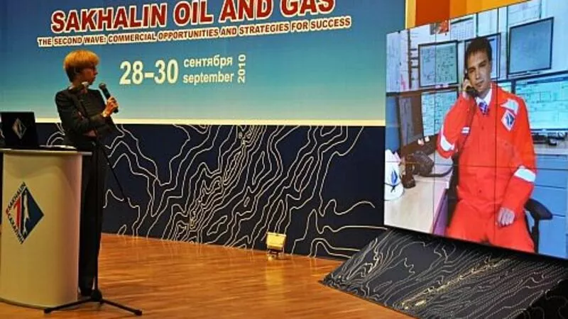 Перед запуском участники конференции посредством телемоста связались с работающими на Одопту специалистами компании «Эксон Нефтегаз Лимитед» Артемом Кожуховым и Андреем Оськиным. А. Кожухов сообщил, что освоение Одопту в рамках проекта «Сахалин-1» началось весной 2009 г. Работать в январе-феврале 2010 г. было сложнее всего из-за суровых климатических условий, однако благодаря огромному опыту команды и современному техническому оборудованию бурение не прекращалось ни на день. Сейчас на месторождении пробурено три скважины: добываемая на них нефть будет поступать по трубопроводу на Береговой комплекс подготовки в Чайво, которое расположено в 75 км от Одопту.