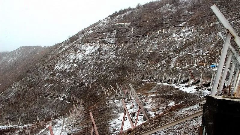 Именно эта часть работ, по мнению специалистов, является самой ответственной, поскольку данная сеть будет нести на себе основную нагрузку по удерживанию снежных масс на 100 тыс. кв. м склона. Всего по этому участку, нависающему над железной дорогой, сооружено 18 рядов снегоудерживающих заборов-ограждений длиной от 50 до 120 м. В ближайшие дни строители намерены завершить монтаж специальной заградительной сетки.