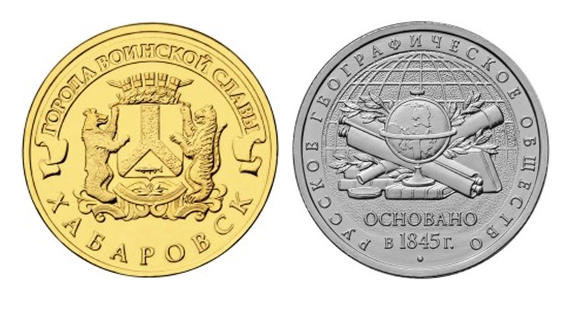 На реверсе десятирублевки из серии «Города воинской славы» изображен герб Хабаровска. Она желтого цвета, размер такой же, как привычной десятирублевой монеты.