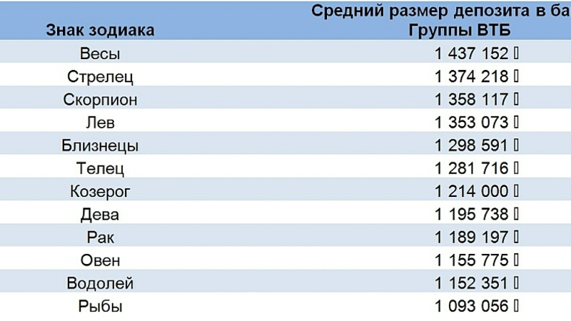 Розничные банки группы ВТБ – ВТБ и ВТБ24 – проанализировали данные по «среднему чеку» депозитов своих клиентов, соотнеся их со знаками зодиака.