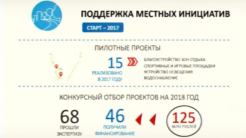 Кроме того, министр отметила, что в 2017 году реализовано 15 проектов. Это благоустройство зон отдыха, устройство освещения и водоснабжения, строительство спортивных и игровых площадок.
