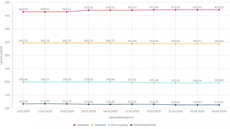 В ассортименте самых популярных мясных продуктов осталась неизменной стоимость говядины — 472,03 рубля за килограмм. Немного подешевела свинина: цена упала на 11 копеек. За килограмм курицы просят на 1,29 рубля больше, чем на прошлой неделе, а мороженую рыбу по-прежнему отпускают по цене 112,61 рубля за единицу веса.