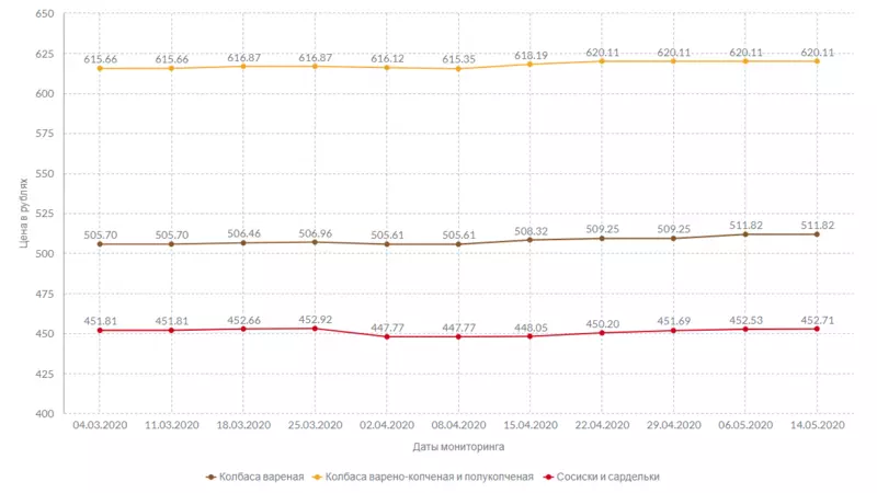 За весовую единицу сосисок и сарделек покупателям придется заплатить на 18 копеек больше, чем на прошлой неделе. Полукопченая и варено-копченая колбаса обойдется в 620 рублей и 11 копеек за килограмм: цена не изменилась в сравнении с предыдущей неделей. Стоимость вареной колбасы также остается стабильной — 511 рублей и 82 копейки за кило.