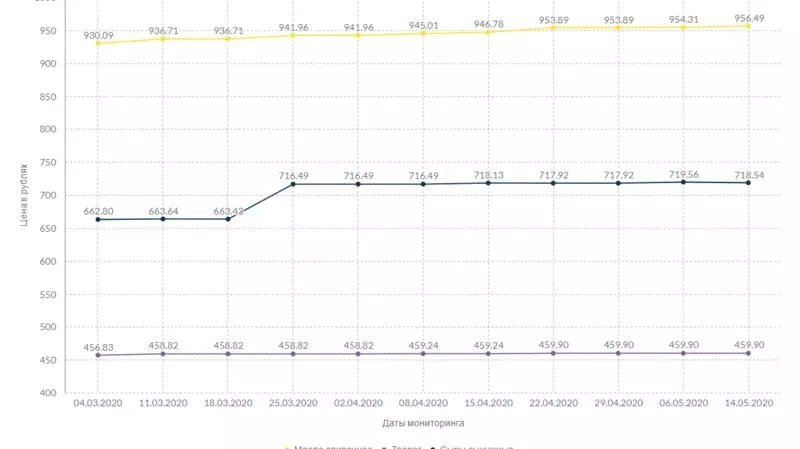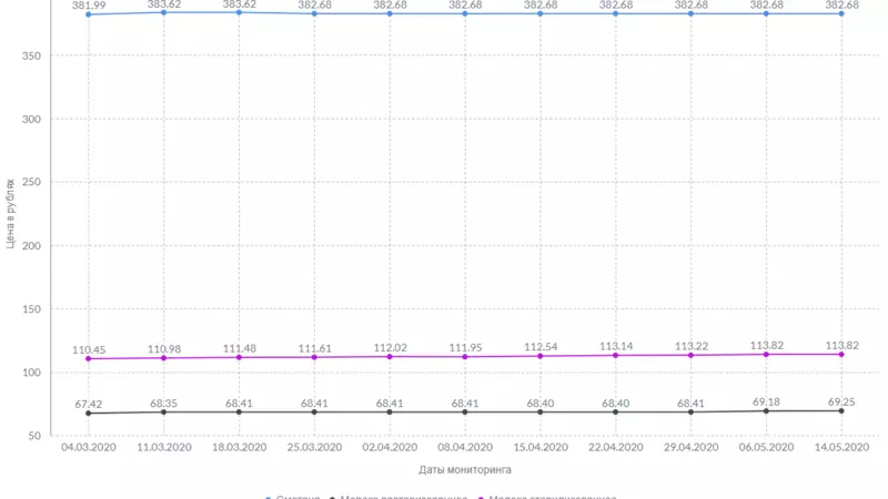 Стоимость сметаны остается на прежнем уровне: 382 рубля и 68 копеек. Не изменилась и цена килограмма творога — за кисломолочный продукт по-прежнему просят 459 рублей и 90 копеек. А вот сыры подешевели: средняя цена на них на 1 рубль и 2 копейки меньше, чем на прошлой неделе.