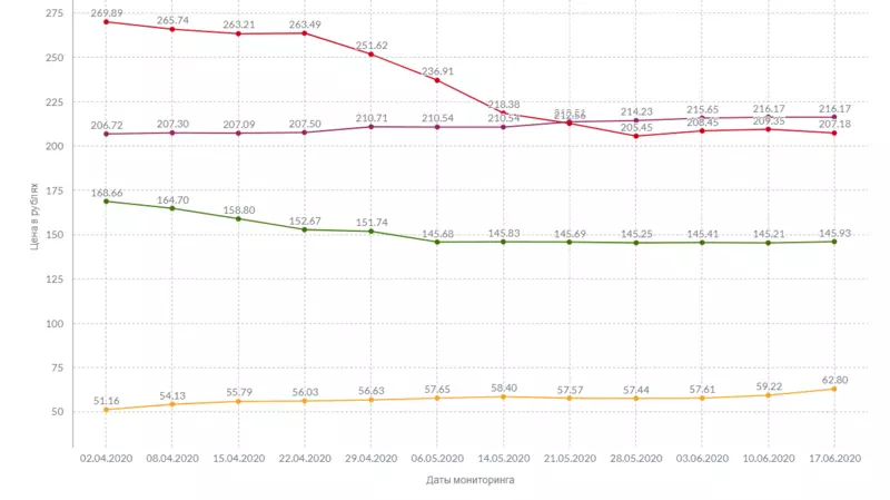 Часть популярных товаров из группы овощей и фруктов отпускают по ценам предыдущей недели. Так, яблоки обойдутся в 216 рублей и 17 копеек за килограмм, картофель — в 41 рубль и 94 копейки.