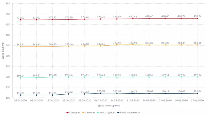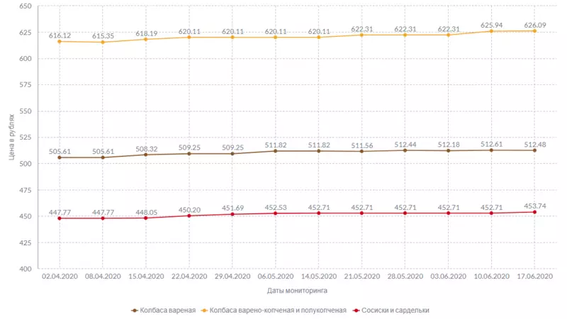 Сосиски и сардельки за неделю подорожали на 1 рубль и 3 копейки, а варено-копченая и полукопченая колбаса — на 15 копеек. При этом стоимость вареной колбасы снизилась на 13 копеек. Мороженая рыба выросла в цене на 96 копеек.