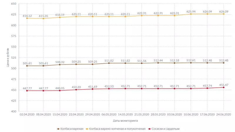 Среди мясных деликатесов осталось неизменной цена за килограмм варено-копченой и полукопченой колбасы — 626 рублей и 9 копеек. Вареная колбаса, как и на прошлой неделе, стоит 512 рублей и 48 копеек, а вот сосиски и сардельки подорожали на 1 рубль и 73 копейки.