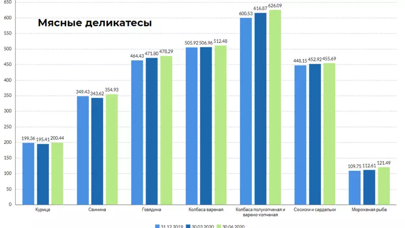 На рынке мясных товаров, в том числе деликатесов, курица подорожала на 5 рублей и 3 копейки за квартал. Однако в сравнении с началом года цена выросла всего на 1 рубль и 8 копеек. Стоимость килограмма свинины увеличилась на 11 рублей и 31 копейку за три месяца, и на 5,5 рубля — за полгода. Говядина подорожала на 6 рублей и 49 копеек за квартал, а за полгода рост составил 13 рублей и 86 копеек. Прибавка к стоимости килограмма мороженой рыбы с апреля по июнь составила 8,88 рубля, а в сравнении с началом года — 11 рублей и 74 копейки.