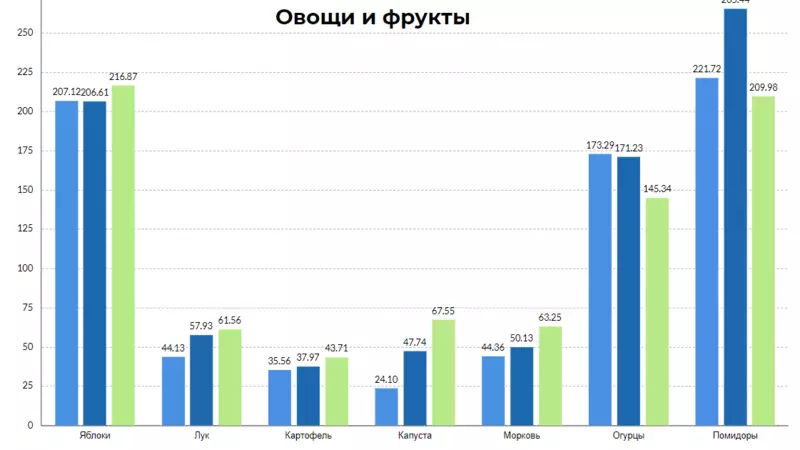 Репчатый лук за три месяца вырос в цене на 3 рубля и 63 копейки, а за полгода — на 17 рублей и 43 копейки. Что касается самых популярных фруктов — яблок, они за три месяца подорожали на 10 рублей и 26 копеек. При этом рост цены за полгода составляет 9 рублей и 75 копеек.