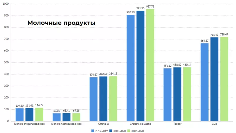На молочном рынке заметно подорожало сливочное масло. В сравнении с первым кварталом 2020 года цена за килограмм выросла на 15 рублей и 82 копейки, а на фоне данных января — на 50 рублей и 55 копеек. Средняя стоимость килограмма сыра увеличилась на 1 рубль и 98 копеек за три месяца. За полгода удорожание составило 53 рубля и 60 копеек. Килограмм творога «подскочил» на 1,32 рубля за квартал и на 9 рублей 2 копейки за шесть месяцев.