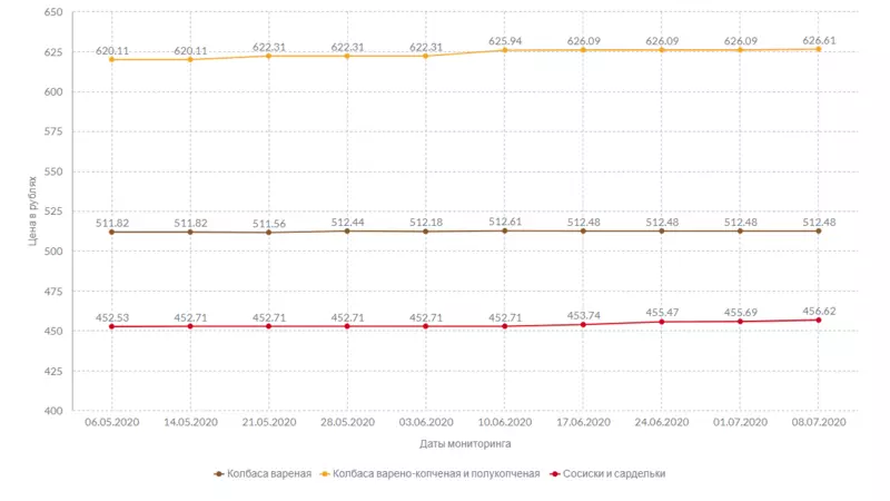 Стоимость вареной колбасы не изменилась за отчетный период: килограмм деликатеса отдают за 512 рублей и 48 копеек. А вот полукопченый и варено-копченый деликатес «прибавил» 52 копейки. Сосиски и сардельки подорожали на 93 копейки.