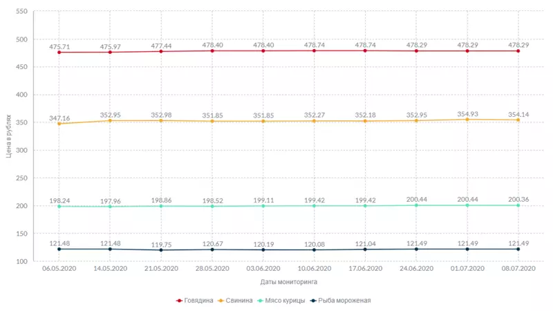В ассортименте наиболее востребованных мясных товаров (в том числе деликатесов) осталось неизменной цена килограмма говядины — 478 рублей и 29 копеек. При этом свинина подешевела на 79 копеек, а курица — на 8 копеек. Стоимость мороженой рыбы остается такой же, как и неделю назад: 121 рубль и 49 копеек за килограмм.