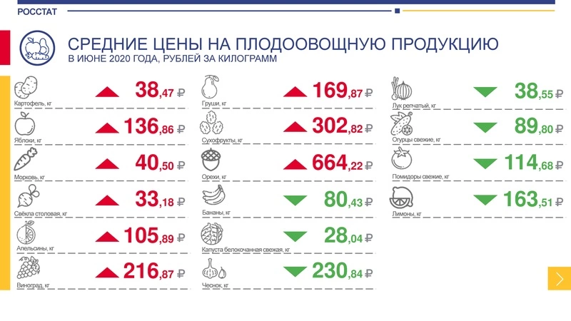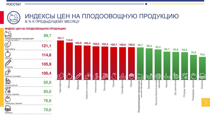 Цены снизились в сегменте плодоовощной продукции: лимоны стали дешевле на 29,4 %, томаты — на 23,2 %, а огурцы — на 15 %. Кроме того, на 8 % стали дешевле авиабилеты экономического класса. На 3,4 % подешевело страхование легковых авто, на 0,3 % — медикаменты.