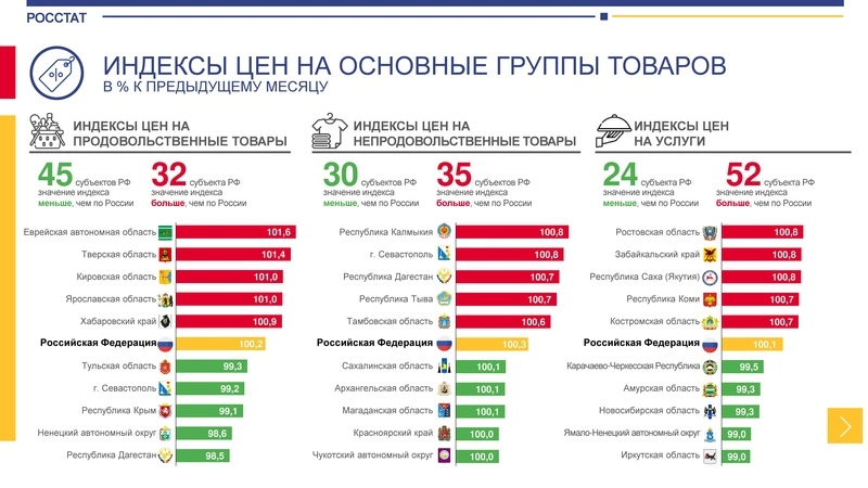 В пятерке «лидеров», чей индекс цен на непродовольственные товары выше общероссийского, Республика Калмыкия и Севастополь (100,8), республики Дагестан и Тыва (100,7), Тамбовская область (100,6). В общей сложности 35 российских субъектов получили индекс, превышающий всероссийский.