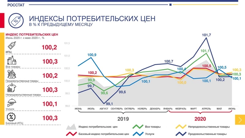 В среднем по России индекс потребительских цен (далее ИПЦ. — Прим. ред.) в июне снизился до 0,2 %. Исследователи подчеркивают, что с начала года это наименьший показатель. Для сравнения майская инфляция — 0,3 %, апрельская — 0,8 %.