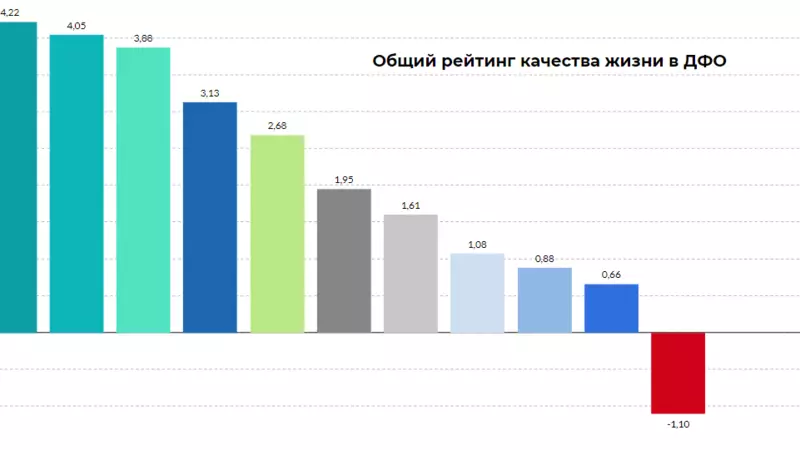 Сахалинская область заняла итоговое четвертое место в дальневосточном рейтинге. С общим показателем 3,13 балла островной регион уступил Хабаровскому краю (4,22), Приморью (4,05) и Якутии (3,88). При этом по числу максимальных оценок за каждый из показателей качества жизни Сахалин и Республика Саха делят первое место: по четырем критериям оба субъекта получили по семь баллов. Хабаровский край заработал всего одну такую оценку, а у Приморья их нет вообще.
