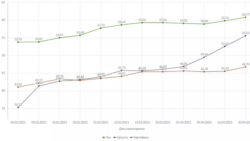 Картофель за неделю вырос в цене на 1 рубль и 22 копейки. На три рубля увеличилась стоимость килограмма белокочанной капусты. Репчатый лук подорожал на 1 рубль и 1 копейку. А за килограмм моркови покупатели заплатят на 16 копеек больше.