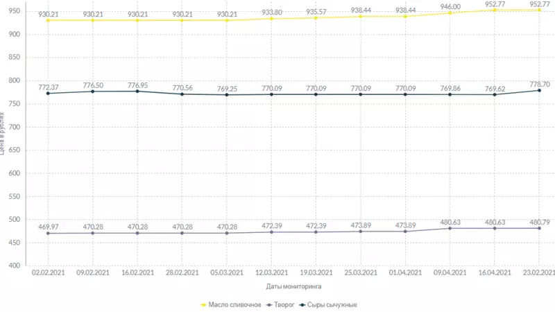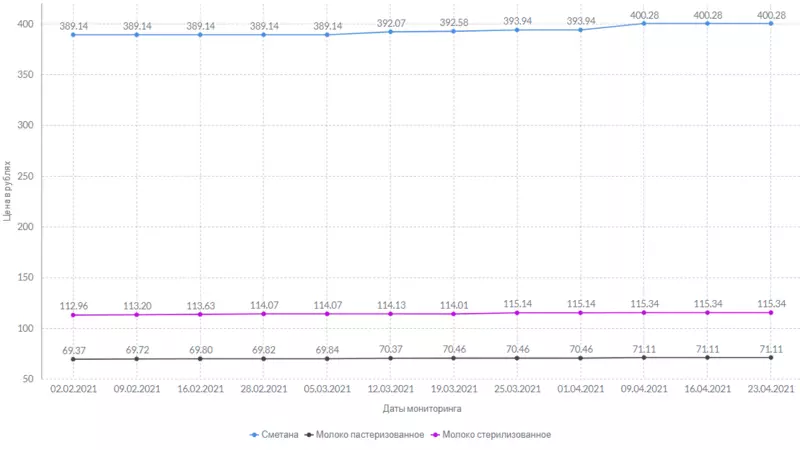 Килограмм сметаны стоит 400 рублей и 28 копеек. Творог подорожал на 16 копеек за неделю, а сыры — в среднем на 9 рублей и 8 копеек.