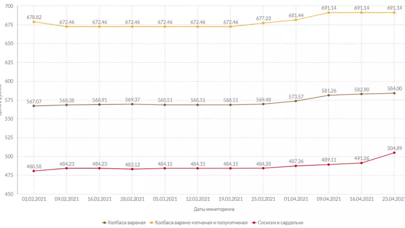 На прилавках с мясными деликатесами осталась неизменной стоимость полукопченой и варено-копченой колбасы. За килограмм продукта продавцы запрашивают 691 рубль и 14 копеек. Вареная колбаса подорожала на 1 рубль и 10 копеек, а сосиски и сардельки прибавили в цене 13 рублей и 63 копейки за неделю.