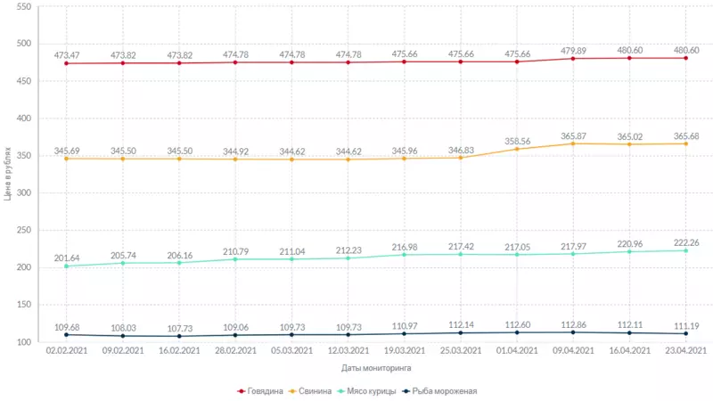 Стоимость килограмма говядины за неделю осталась на прежнем уровне — 480 рублей и 60 копеек. Свинина подорожала на 66 копеек, курица — на 1 рубль и 30 копеек за это же время. Мороженая неразделанная рыба подешевела на 92 копейки.