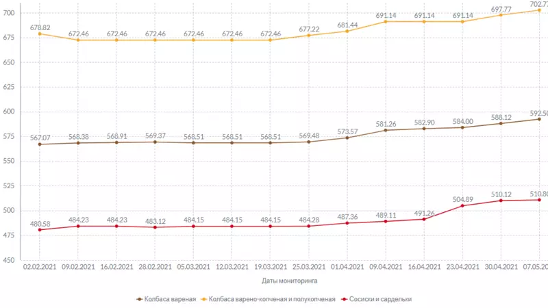На рынке колбас подорожали сосиски и сардельки: за килограмм просят на 68 копеек больше. На пять рублей за неделю выросла стоимость полукопченой и варено-копченой колбасы, а за килограмм вареной запрашивают на 4 рубля и 38 копеек больше.